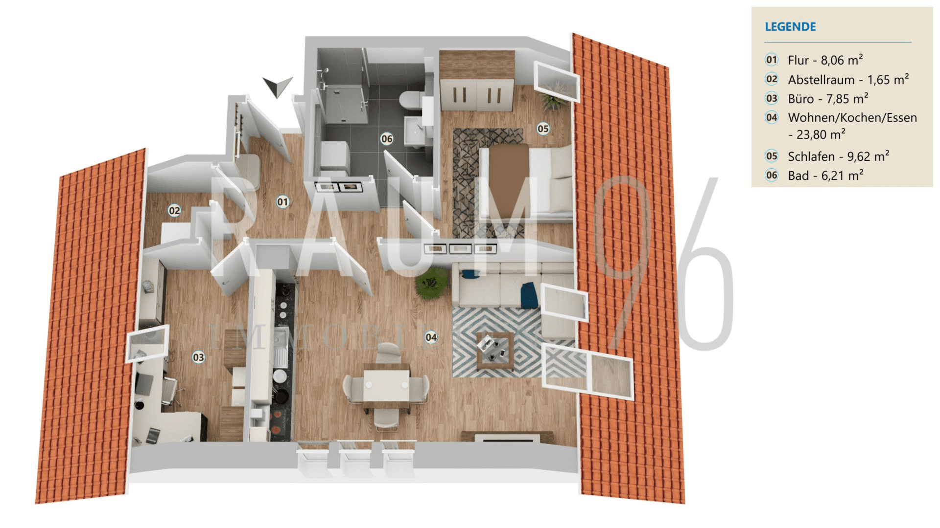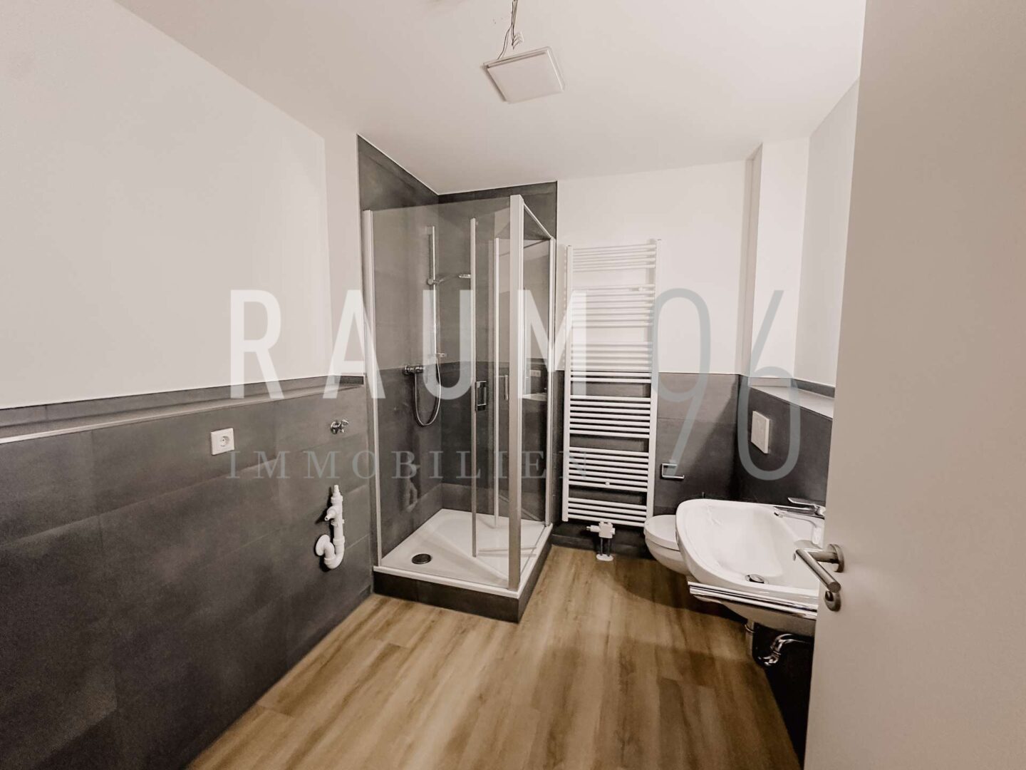 In den Wohn- und Schlafräumen wurde ein hochwertiger, moderner Vinylboden in stilvoller Holzoptik verlegt, der den zeitgemäßen Charakter der Wohnung unterstreicht. Auch das Badezimmer präsentiert sich mit hochwertigen, großformatigen grauen Fliesen in einem eleganten Design.