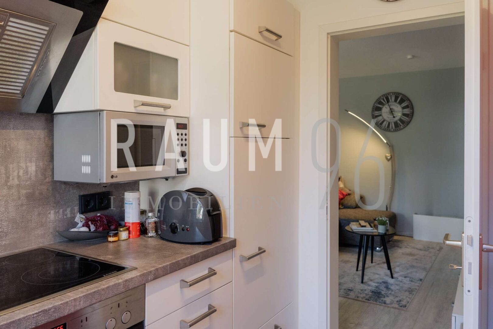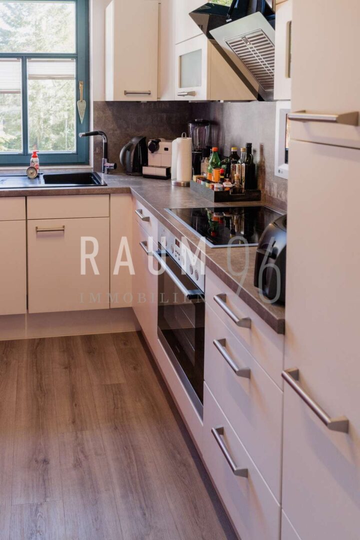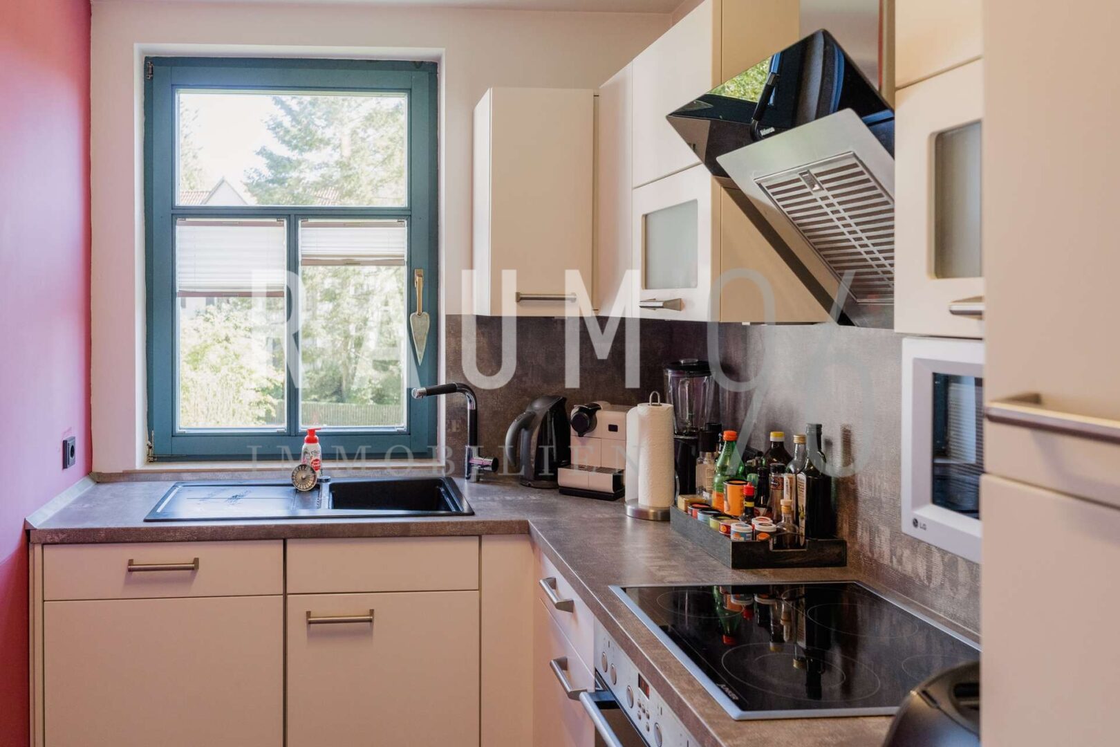 Die angrenzende Küche, ebenfalls lichtdurchflutet, ist durch eine Tür vom Wohnbereich separiert und bereits mit einer hochwertigen Einbauküche aus dem Jahr 2014 (Küchen Max) ausgestattet, die im Kaufpreis enthalten ist.