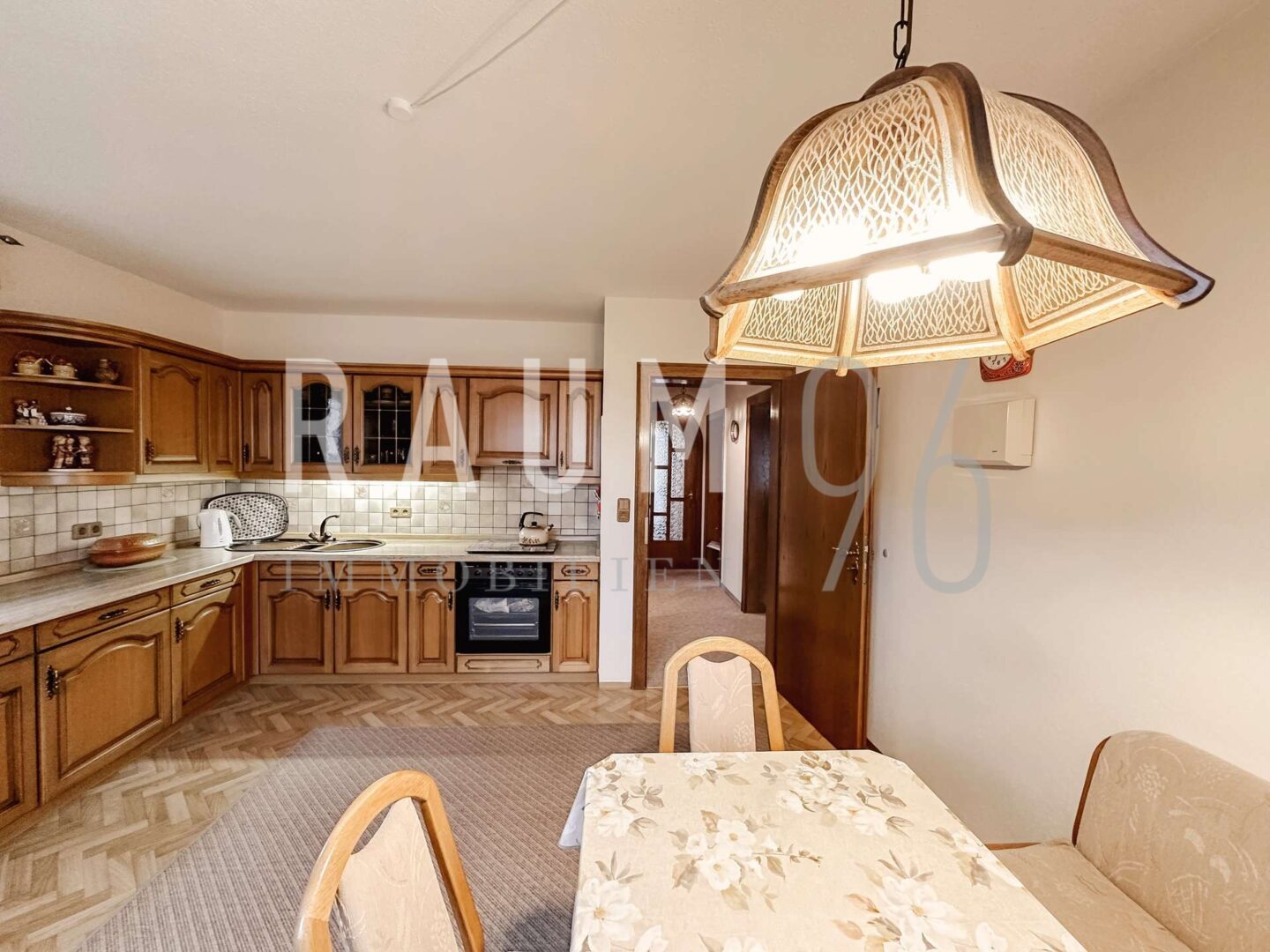 Das helle Wohnzimmer bietet direkten Zugang zum Balkon mit schönem Blick in den Garten – ein idealer Ort zum Entspannen. Die geräumige Küche bietet viel Platz und lädt zum gemeinsamen Kochen und Verweilen ein.