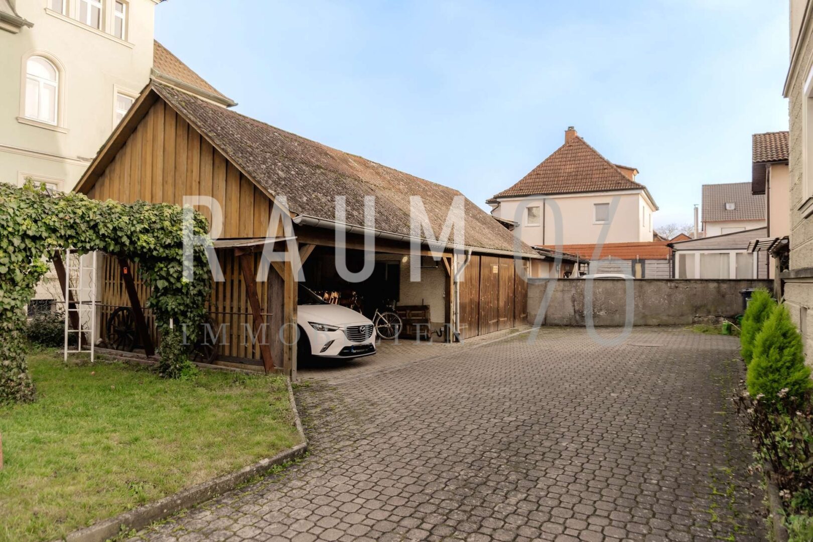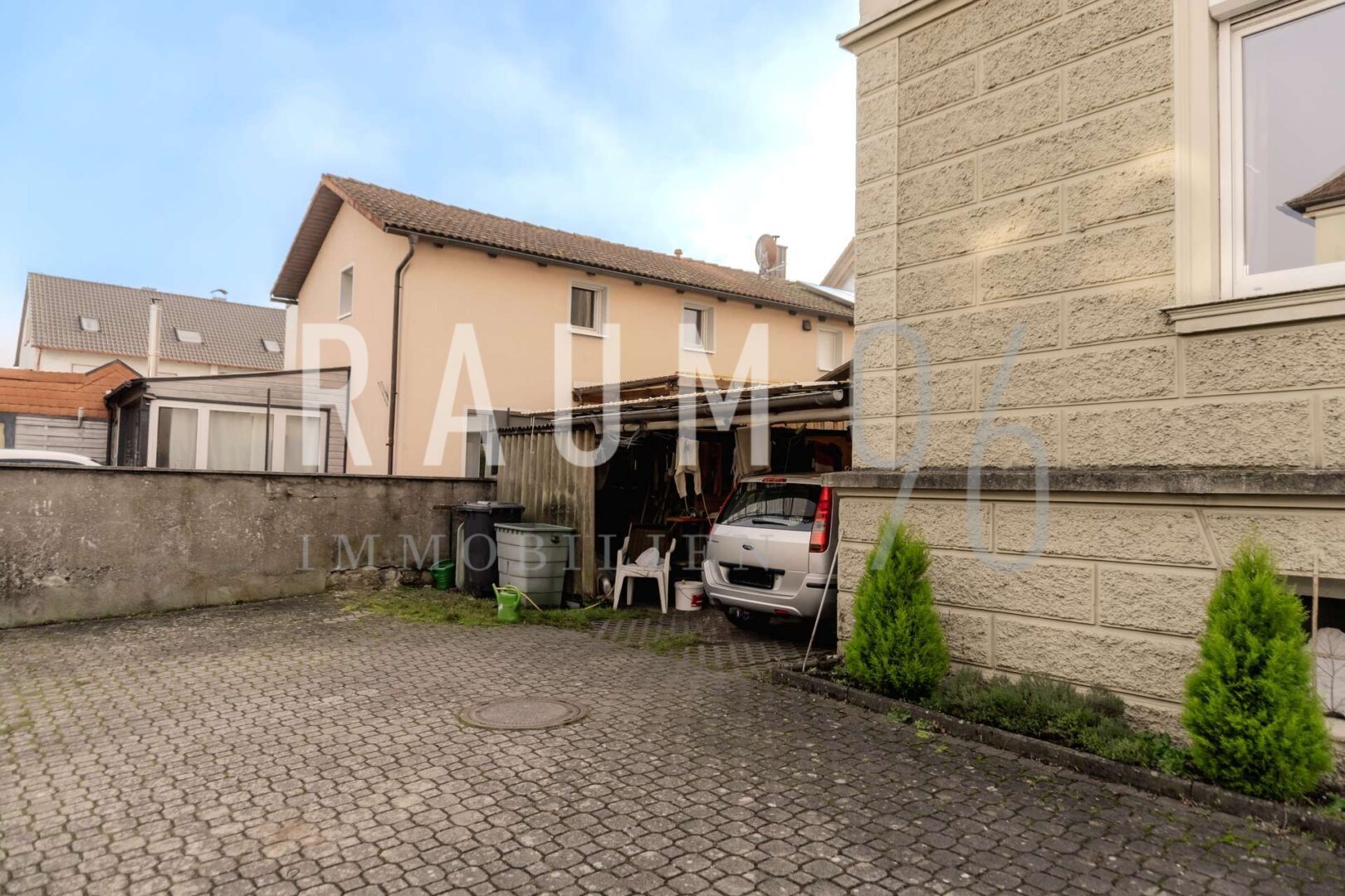 Auf dem Grundstück stehen insgesamt zwei Garagenstellplätze (derzeit fremd vermietet), zwei Carport-Stellplätze (zugeordnet an die Mieter im Erdgeschoss und 1. Obergeschoss) sowie zwei Außenstellplätze zur Verfügung. Einer der Außenstellplätze wird ebenfalls vom Mieter im Erdgeschoss genutzt.