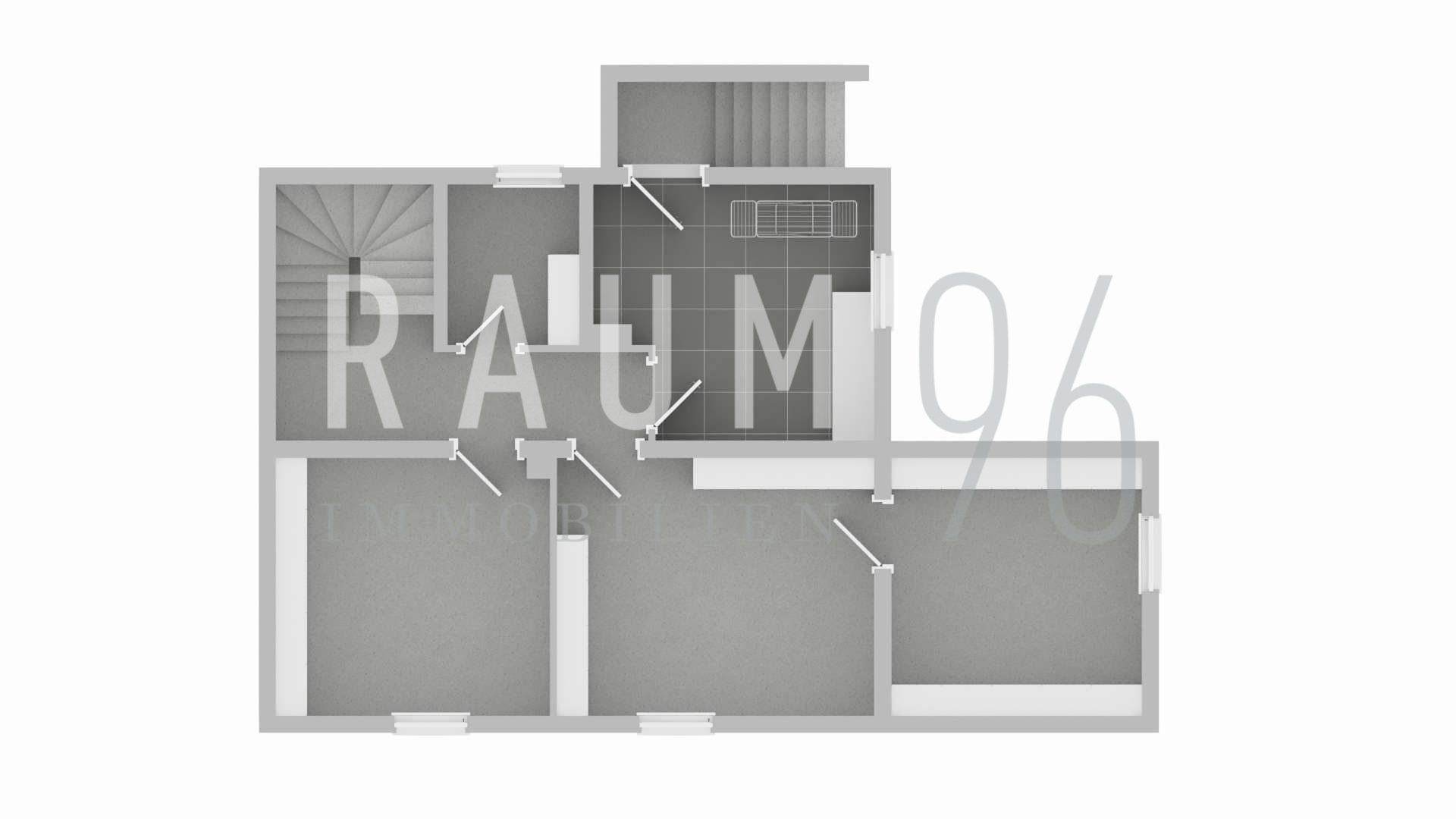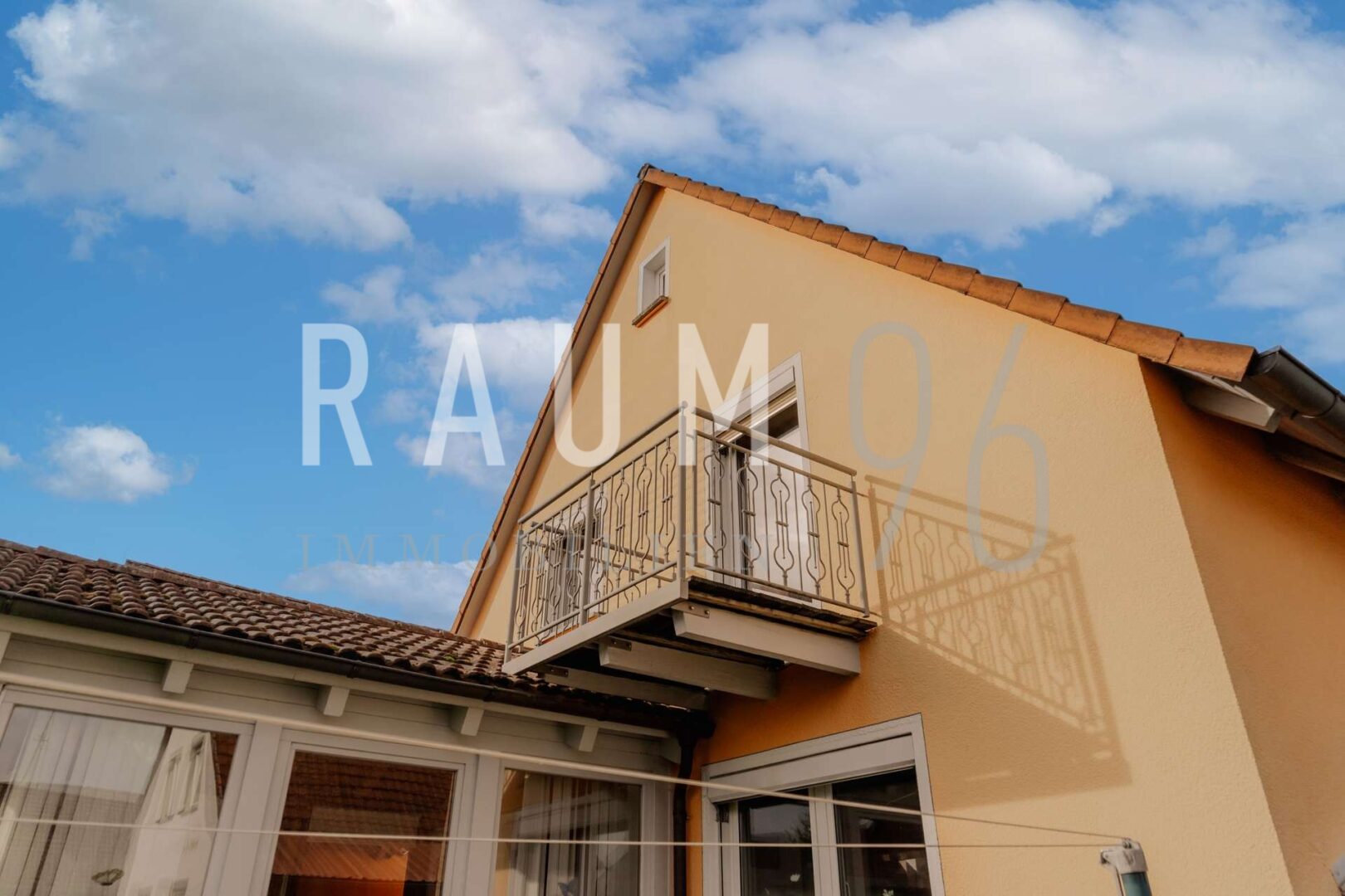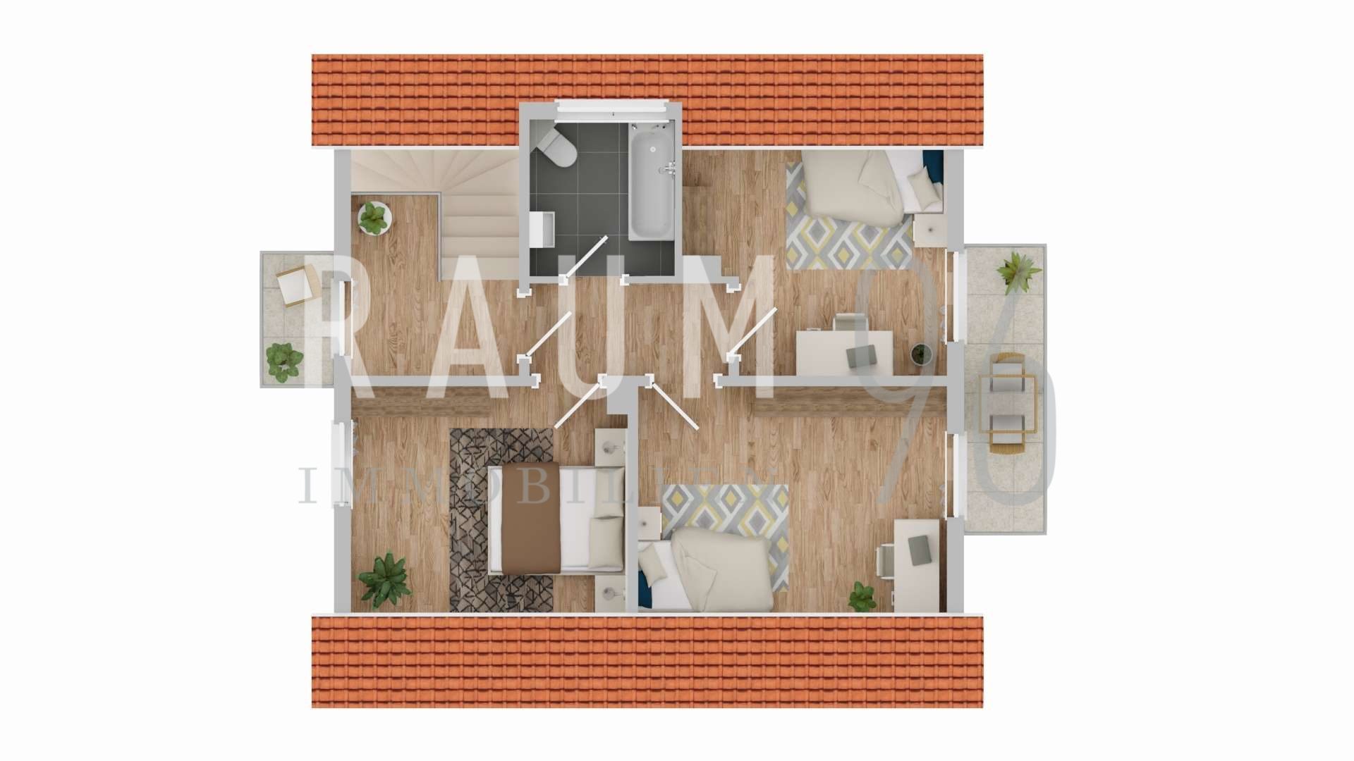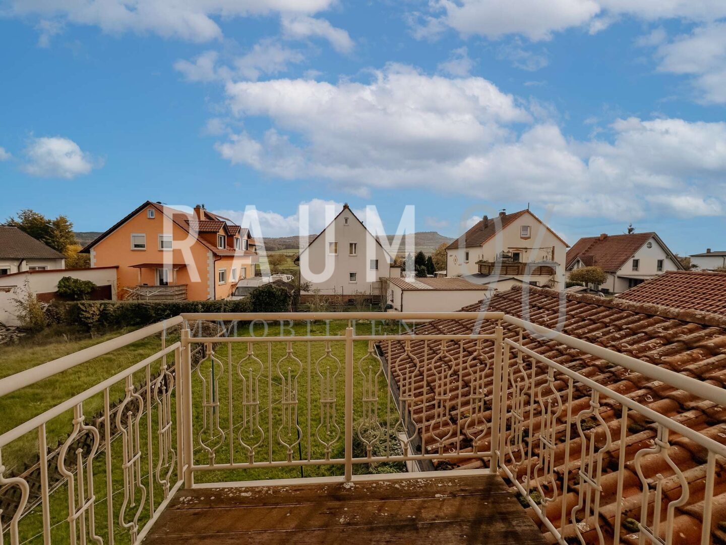 Im Obergeschoss warten drei weitere Zimmer, die flexibel nutzbar sind, sowie ein zweites Badezimmer. Vom Schlafzimmer aus führt der Zugang auf den Balkon, von dem aus der Blick bis zum Staffelberg reicht. Ein kleiner Platz für Ruhe und Momente im Freien.