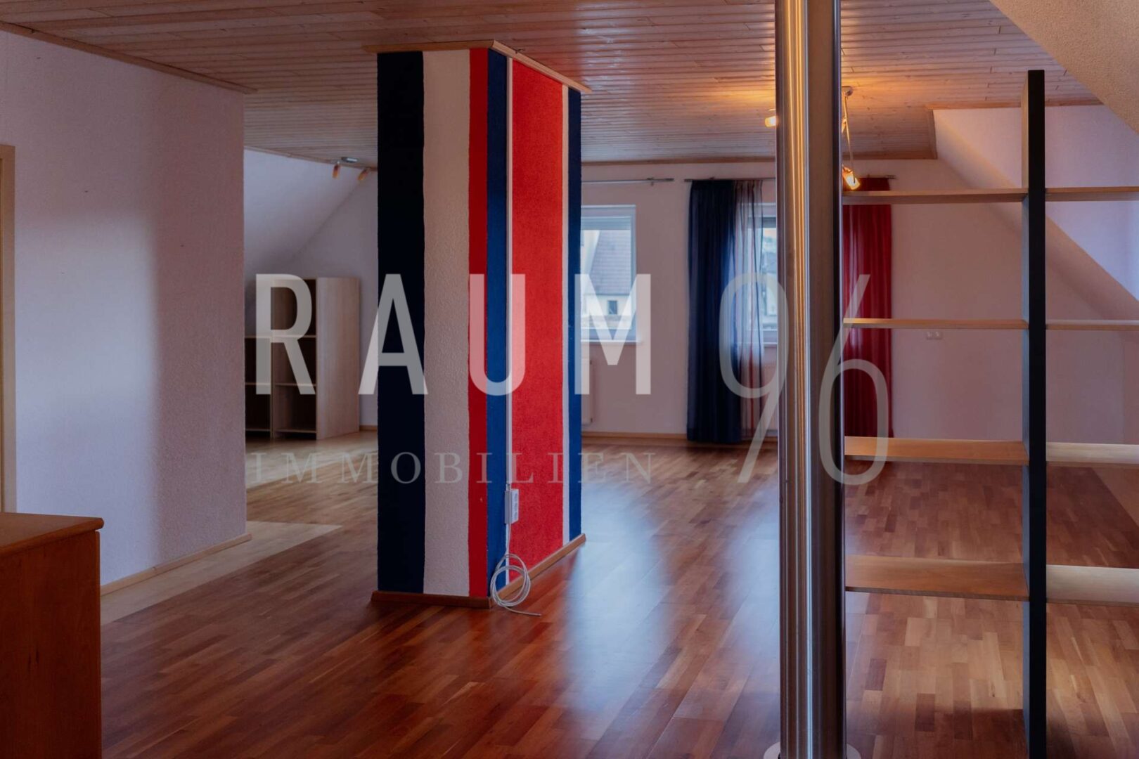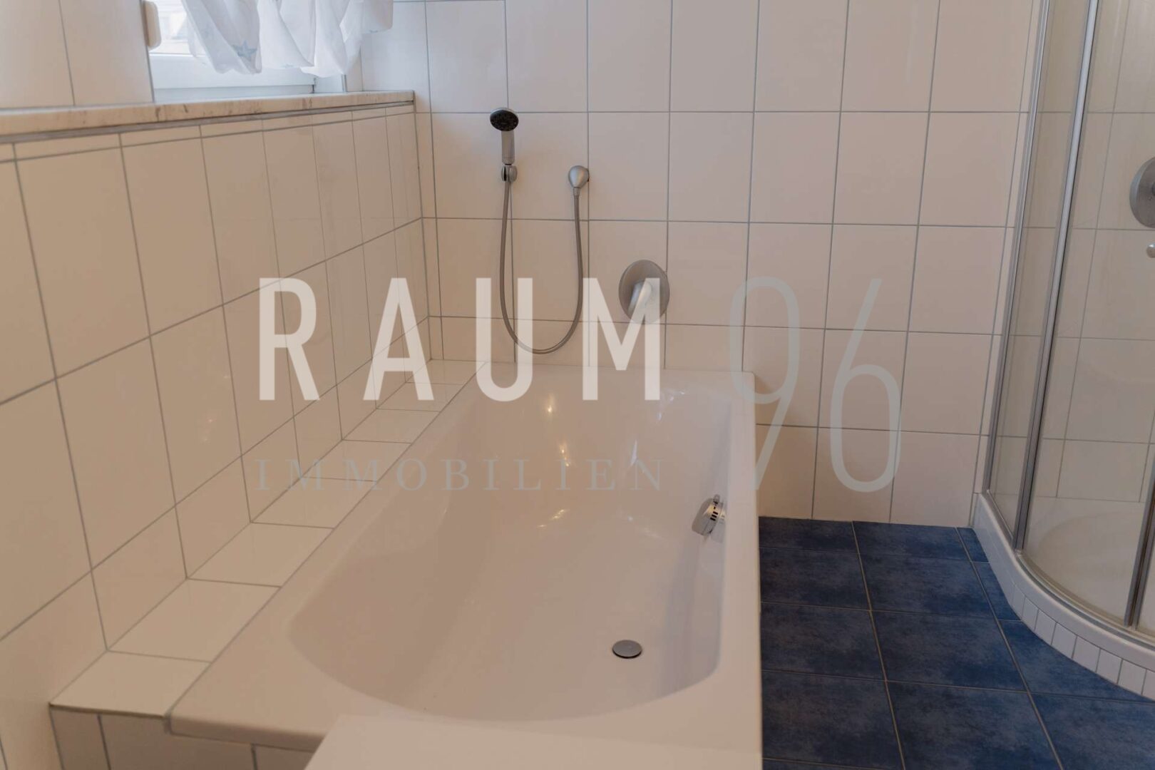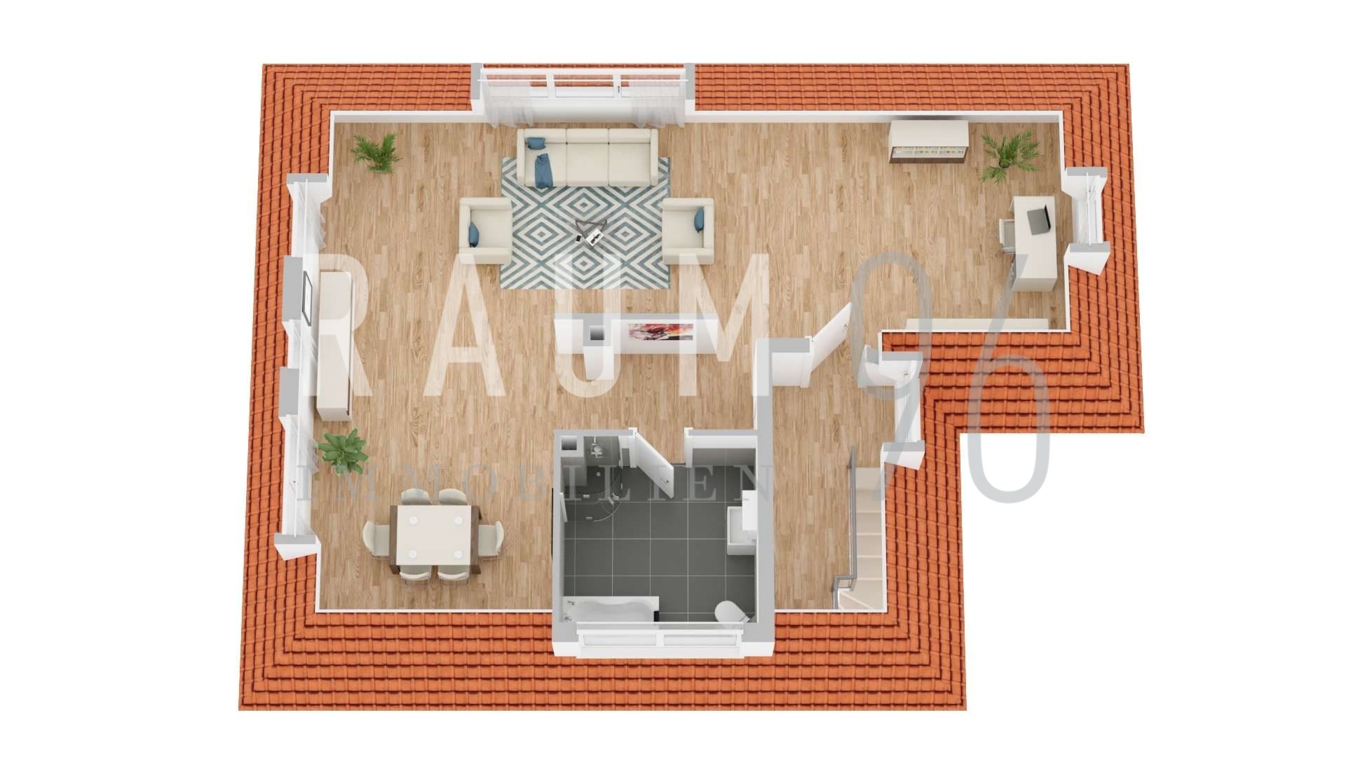 Das Dachgeschoss mit 80m² präsentiert sich als großzügige Loftwohnung, die viel Raum für individuelle Gestaltungsideen bietet. Das geräumige Badezimmer ist mit Steinfliesen, WC, Badewanne und Dusche ausgestattet.