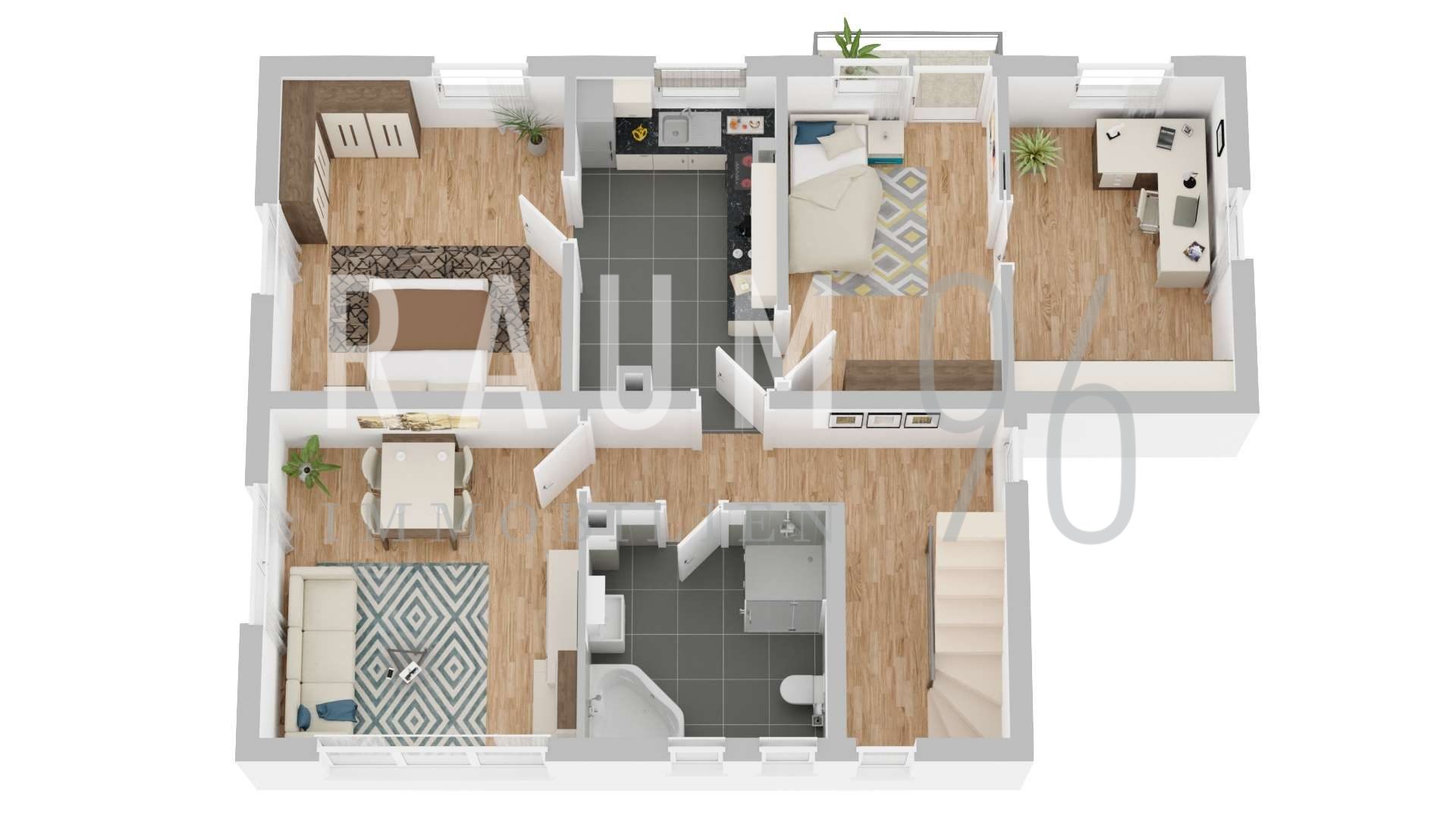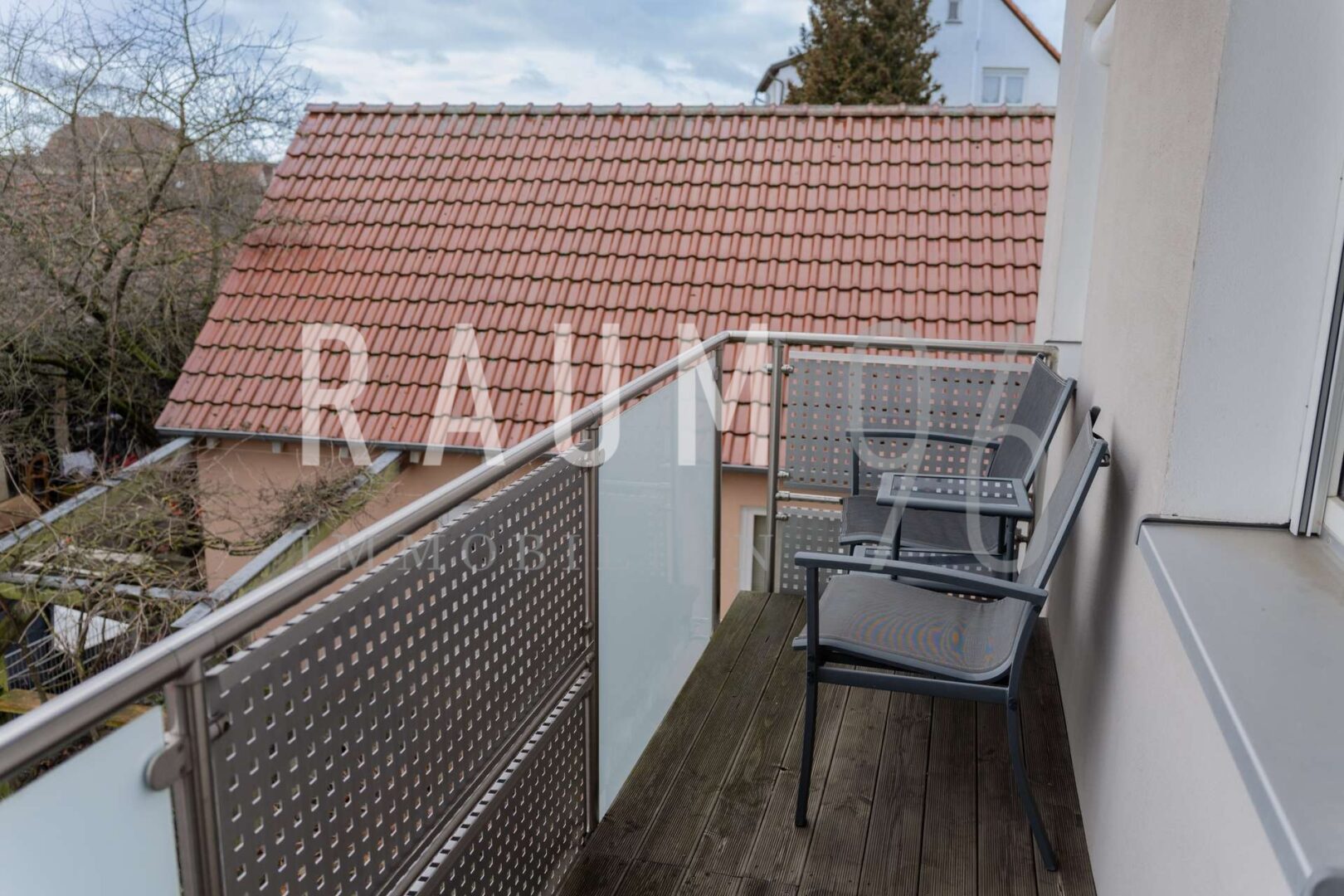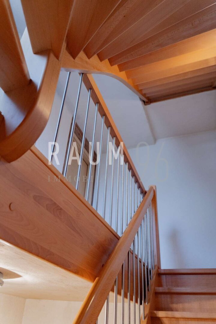 Die Holztreppe führt ins erste Obergeschoss zu einer 3-Zimmer-Wohnung mit 80m² und Balkon. Das moderne Badezimmer verfügt über schwarze Fliesen in Marmoroptik, die in harmonischem Kontrast zu den weißen Fliesen stehen. Dusche, Badewanne und WC sind vorhanden. Die Küche führt Sie zu Schlafzimmer und Kinderzimmer mit Balkon, sowie zu einem zusätzlichen Raum, der als Büro genutzt werden kann. Der südausgerichtete Balkon ist durch ein Edelstahlgeländer gesichert.